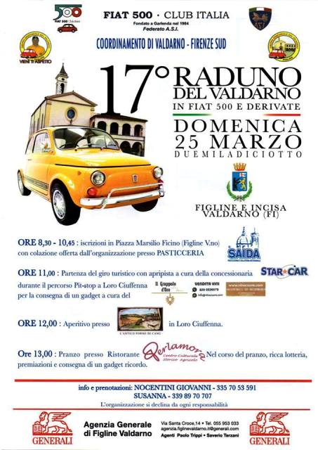Sarà il Raduno del Valdarno in Fiat 500 e derivate numero 17 quello in programma a Figline per la mattina di domenica 25 marzo. Le iscrizioni si svolgeranno dalle 8,30 alle 10,45 in piazza Marsilio Ficino, dove la pasticceria Saida offrirà la colazione a tutti i partecipanti al raduno. La partenza del giro turistico, invece, è prevista alle 11, con la concessionaria Star Car a fare da apripista. Durante il tour, ci sarà modo di fare un Pit stop a Loro Ciuffenna, dove l’azienda Il Grappolo d’Oro consegnerà alcuni gadget. Ed è sempre a Loro Ciuffenna che, alle ore 12, si terrà un aperitivo presso L’Antico forno di Canu.