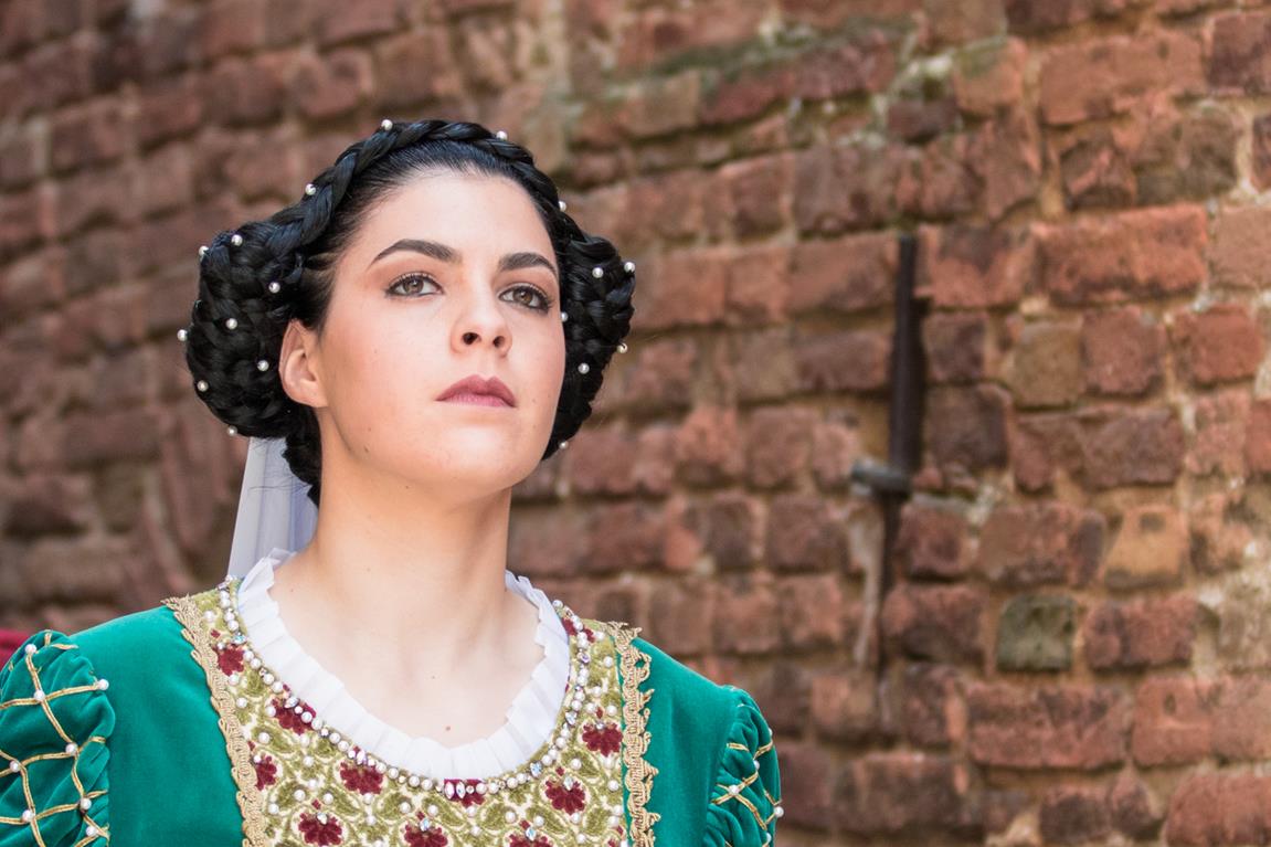 E quindi il programma della mattina del giorno di festa è quasi una rappresentazione storica, elegante e ben orchestrata. Alle 9.00 le comparse delle singole contrade, provenienti in corteo dai propri territori, si ritrovano nella centrale Piazza Matteotti per poi partecipare alla Messa, nella Chiesa della S.S. Flora e Lucilla, preceduta quest’anno dalla benedizione delle Palme. Al termine della funzione religiosa protagonisti della scena diventano gli sbandieratori e tamburini che propongono i propri spettacolari numeri di abilità. Alle 11.45 muove il corteo storico che attraversa tutto il centro cittadino. Oltre 200 figuranti rappresenteranno l’orgoglio dei torritesi ed il forte senso di appartenenza alla comunità; attesissima anche la sfida a distanza tra le dame, le cui acconciature vengono preparate durante la notte per apparire, a sorpresa, nella passeggiata in costume. Il corteo si conclude al Gioco del Pallone la grande piazza, cioè, dove i torritesi giocavano (e giocano) alla palla al bracciale ed al tamburello e che a fine marzo diventa il Campo di gara; qui è infatti tracciato l’anello di tufo che, dalle 16.00, ospita la sfida, in un clima da stadio.