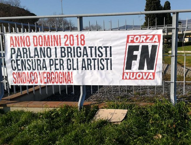 Non si placano le polemiche sul concerto di Povia a Seano. Dopo le parole del sindaco che ha definito "inopportuna" la sua presenza, i militanti di Forza Nuova hanno usato uno striscione per attaccare Prestanti: "Parlano i brigatisti, censura per gli artisti. Sindaco vergogna!", si legge.