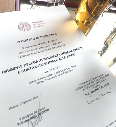 A ricevere l’attestato di frequenza del corso è stato, tra gli altri, anche il sindaco di Fucecchio Alessio Spinelli che da tempo è fortemente impegnato su questo tema e che grazie alla collaborazione di altre amministrazioni pubbliche e del Dipartimento di Filosofia, Sociologia, Pedagogia e Psicologia applicata dell’Università di Padova è riuscito nell’intento di realizzare questo percorso per formare nuove figure professionali che potranno fungere da trait d’union tra le amministrazioni pubbliche e le forze dell’ordine. L’obiettivo è quello di fornire nuovi strumenti per la prevenzione ed il contrasto alla criminalità nel comune impegno per garantire maggiore sicurezza ai cittadini.