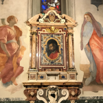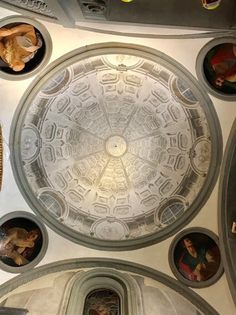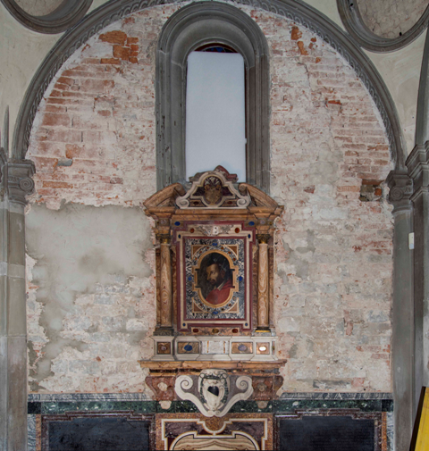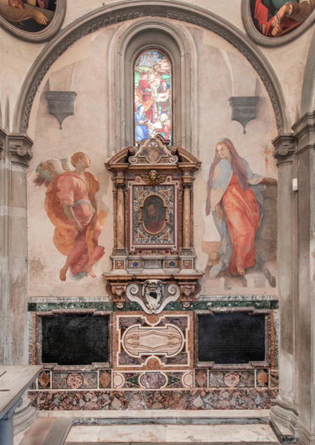 Lo stesso può dirsi dei variegati marmi che compongono il bellissimo monumento seicentesco, in commesso di pietre dure, dedicato a S. Carlo Borromeo, nonostante la forte cesura creata nell'impianto prospettico ideato dal Pontormo e che separa la Madonna dall’Angelo annunciante. Anche le antiche lapidi sepolcrali ed encomiastiche sono tornate con i marmi lucidi e le scritte leggibili e risaltano ancor più sugli intonaci ora puliti e luminosi. Novità assoluta, inoltre, è la scopritura della decorazione a lacunari della cupolina, realizzata da Domenico Stagi intorno al 1770 e celata, oramai da più di ottanta anni, da uno spesso strato di calce.