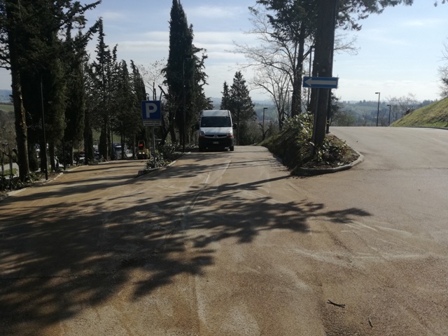 I quasi 50 posti auto con le strisce blu, situati lungo via San Giorsolè a ridosso della cinta muraria del borgo alto, su una superficie scoscesa, mascherati da alberi agli occhi di chi osserva il borgo da lontano, sono un’area adibita a parcheggio dalla metà degli anni ’80 e sistemata progressivamente in termini di finiture e servizi. Un’area comunque sempre sottoposta a forte usura, sia per il transito che per il fatto di essere in pendenza. Da qui gli ultimi lavori di rifacimento che hanno visto la sostituzione di lampioni e pilastri con corpi illuminanti simili a quelli del più recente e adiacente parcheggio riservato ai residenti e con illuminazione a led. E soprattutto la sistemazione della regimazione idraulica e della superficie stradale con pavimentazione con prodotto bituminoso tipo “Sacatrasparent” (colore tipo sabbia) più adatta al contesto storico architettonico del borgo alto rispetto all’asfalto. Sistemato anche il verde con nuove piantumazioni.