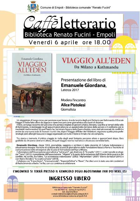 Torna un nuovo appuntamento con il “Caffè letterario” della biblioteca comunale Renato Fucini di Empoli. Venerdì 6 aprile 2018 alle 18 ospite dell’iniziativa l’autore e grande viaggiatore Emanuele Giordana che presenterà il suo libro intitolato “Viaggio all’Eden. da Milano a Kathmandu” edizione Laterza, 2017.