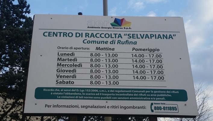 Si ricordano gli orari del Centro raccolta di Selvapiana. Da lunedì a venerdì 8-13 e 14-17, il sabato dalle 8 alle 13.