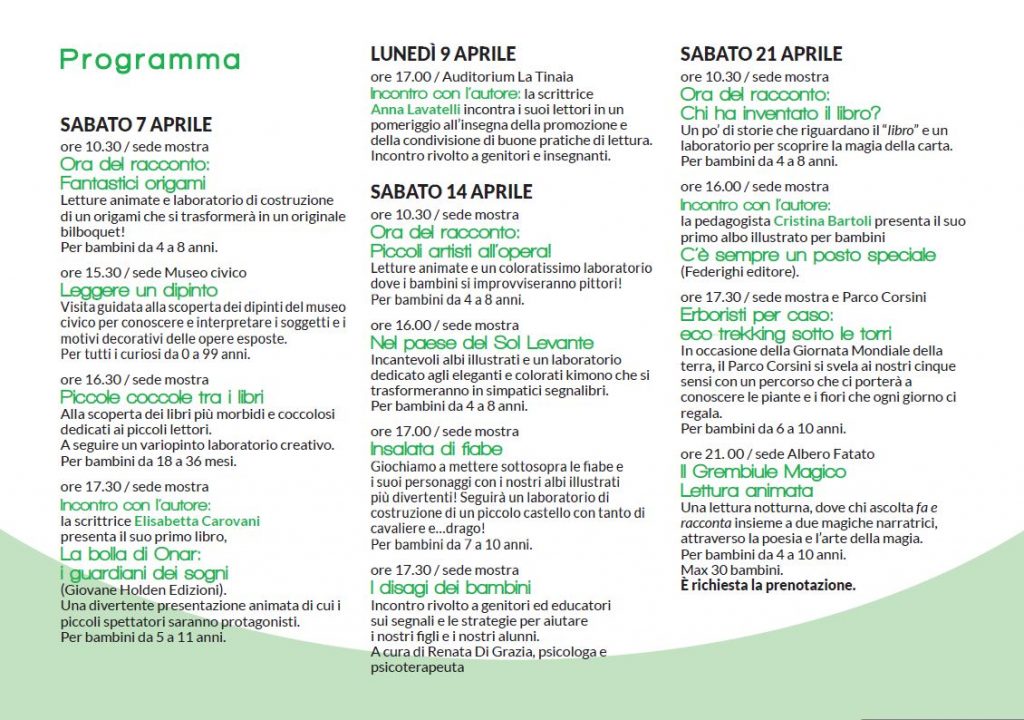 A conclusione dell’intera manifestazione una speciale lettura “notturna” Il grembiule magico coinvolgerà giovani ascoltatori di storie. I laboratori e le letture sono a cura della cooperativa Promocultura. Tutti gli ingressi sono gratuiti.
