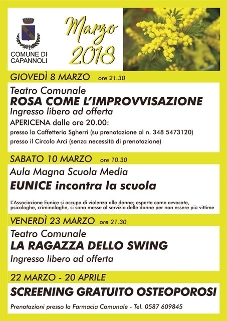 L'Amministrazione Comunale ha organizzato due spettacoli teatrali, “Rosa come improvvisazione” e “La Ragazza dello swing”, a cui la cittadinanza ha partecipato numerosa. Il ricavato di tali eventi è stato destinato appunto ad Eunice, l'associazione che si occupa di violenza sulle donne nel nostro territorio.