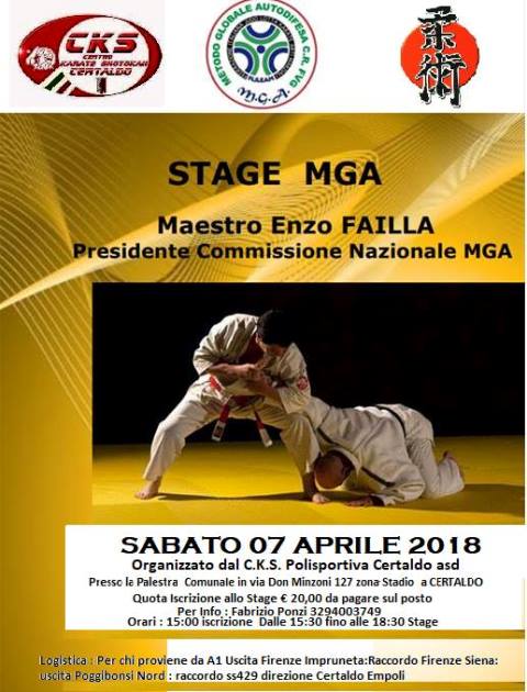 La CSK Polisportiva Certaldo asd ha organizzato per sabato 7 aprile, presso la palestra Comunale di Certaldo zona stadio via Don Minzoni 127 dalle 15:00 alle 18:30, uno Stage con il presidente della commissione nazionale MGA ( Metodo Globale Autodifesa) il Maestro Enzo Failla.
