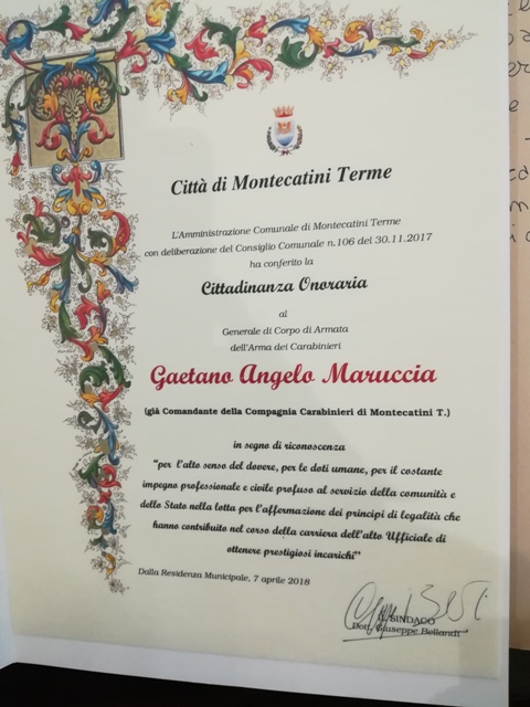 A Maruccia, già comandante della compagnia di Montecatini dal 1984 al 1989, un emozionato sindaco Bellandi ha conferito la cittadinanza onoraria con una pergamena riportante la dicitura "In segno di riconoscenza, per l'alto senso del dovere, per le doti umane, per il costante impegno professionale e civile profuso al servizio della comunità e dello Stato nella lotta per l'affermazione dei principi di legalità, che hanno contribuito nel corso della carriera dell'Alto Ufficiale di ottenere prestigiosi incarichi".