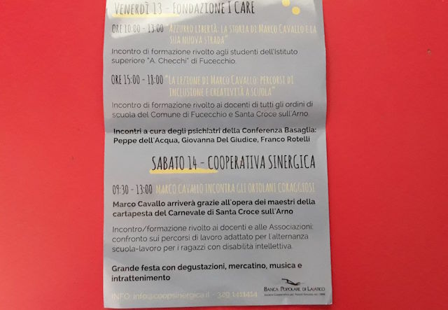 Venerdì ci sarà un incontro di ormazione rivolto agli studenti del Checchi di Fucecchio al mattino, mentre nel pomeriggio la formazione sarà dedicata ai docenti di Fucecchio e Santa Croce. Ospiti d'eccezione saranno Franco Rotelli e anche Peppe Dell'Acqua e Giovanna Del Giudice, collaboratori di Franco Basaglia. Sabato invece ci si sposterà a San Pierino e Marco Cavallo sarà accolto da letture, animazione e degustazioni. In più i maestri della cartapesta di Santa Croce costruiranno la lumaca bendata (simbolo della cooperativa) assieme ai bambini.Spazio anche al cabaret con 'I Soffritti'.