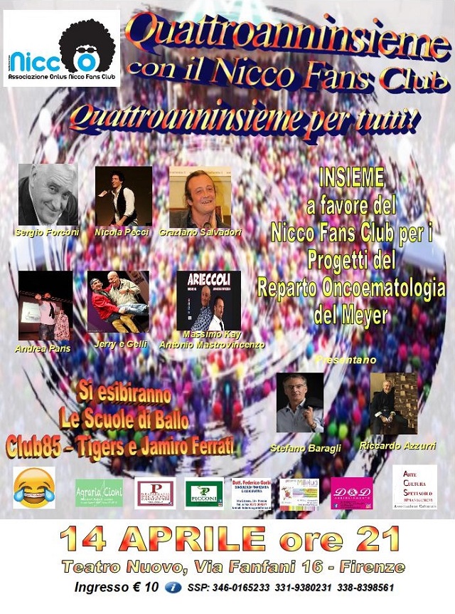 Quattroanninsieme con il Nicco Fans Club, Quattroanninsieme per tutti, questo è il titolo dello spettacolo con il quale Federico Matteucci e la moglie Silvia Sagi festeggeranno, sabato 14 Aprile, al Teatro Nuovo di Firenze di via Fanfani, il quarto compleanno dell'Associazione nata da una pagina facebook aperta per il figlio Niccolò, che fu ricoverato al Meyer per una malattia oncologica.