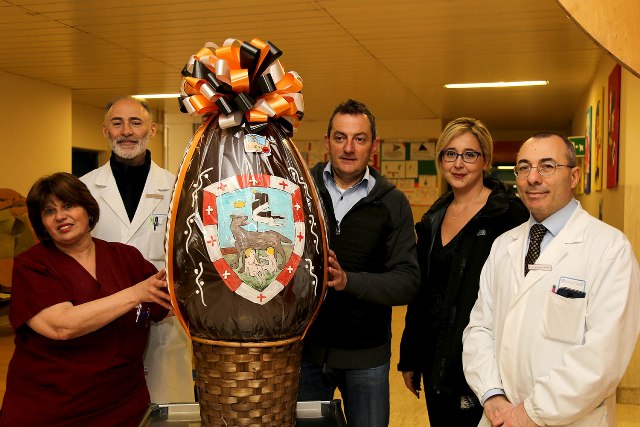 Un grande uovo di cioccolato per donare un sorriso ai piccoli pazienti dell’UOC Pediatria dell’Azienda ospedaliero-universitaria Senese, diretta dal professor Salvatore Grosso. È questo il pensiero della Contrada della Lupa e del barbaresco Leonardo Giorgi, che hanno donato il dolce ai bambini ricoverati al policlinico Santa Maria alle Scotte. Un dono che conclude il ciclo di eventi legati alla Pasqua nel Dipartimento Materno-Infantile dell’Aou Senese: una lunga serie di dimostrazioni di generosità, per di più prolungate nel tempo, a dimostrazione della grande sensibilità per i piccoli degenti dell’ospedale di Siena. Ad accogliere il barbaresco della Lupa la Direzione Aziendale con il professor Salvatore Grosso insieme alla coordinatrice infermieristica Giuliana Masiero e al chirurgo Michele Giubbolini.