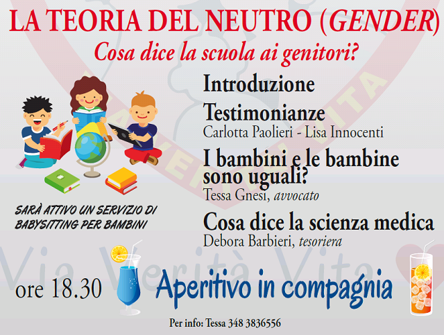 Domenica 15 aprile, a quasi un anno esatto dalla sua nascita, l’Associazione Via Verità Vita di Empoli presenta ufficialmente alla collettività i suoi membri, organizzando un incontro presso la sua sede, nella Chiesa del Sacro Cuore di Gesù a Fontanella dal titolo “L'Associazione Via Verità Vita si presenta” ed i suoi consiglieri, Debora Barbieri, Carlotta Paolieri ed il Presidente avv. Tessa Gnesi, affronteranno il tema dell’educazione al "neutro” che è l’ultima tendenza ormai in molte scuole anche materne, e di cosa dice al riguardo la scienza medica secondo dati raccolti nell’aggiornatissimo report internazionale “sessualità e genere” , per riflettere con i genitori -che sono i diretti interessati - anche su eventuali ulteriori implicazioni sulla salute dei loro figli.