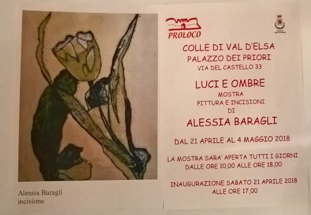 A Colle di Val d'Elsa è in mostra 'Luci e ombre' di Alessia Baragli, artista fiorentina diplomata all'Accademia di Belle Arti e specializzata in Arti Visive. Dal 21 aprile al 4 maggio 2018 la mostra sarà aperta tutti i giorni dalle 10 alle 18, l'inaugurazione sarà il 21 aprile alle 17. La mostra si terrà al Palazzo dei Priori in via del Castello.