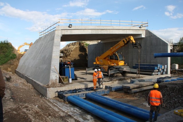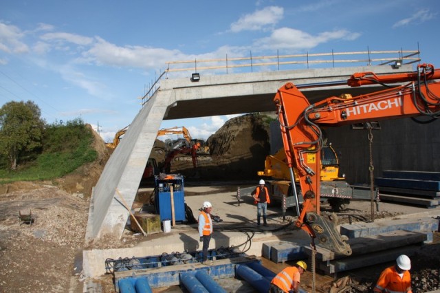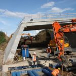 Sul lato di spinta è stata realizzata la platea di varo (sulla quale scorre il manufatto) e la struttura reggispinta, costituita da diaframmi in calcestruzzo, che contrastano l’azione dei sei martinetti idraulici impiegati che spingono la struttura.