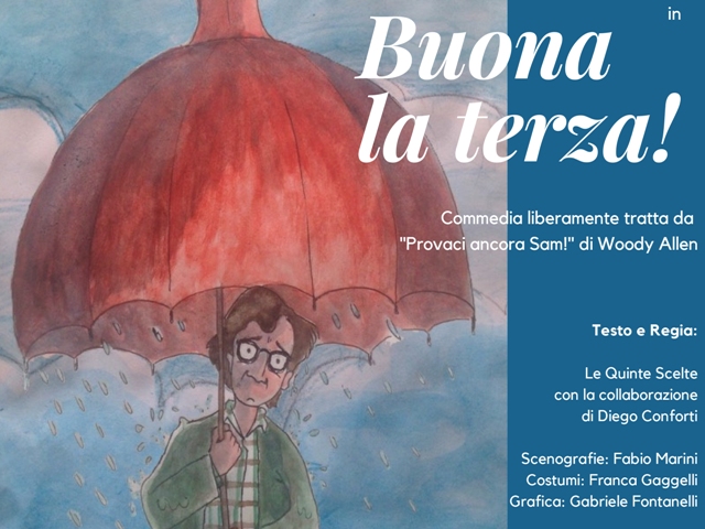 Dopo il successo sabato 7 aprile della commedia Una mosca cieca per l’ispettore Pepe nell’allestimento degli Spiattori, sabato 21 aprile alle 21.00 è la volta della compagnia Le quinte scelte, con la collaborazione di Diego Conforti, che metterà i scena lo spettacolo Buona la terza , una commedia liberamente tratta da "Provaci ancora, Sam" di Woody Allen.