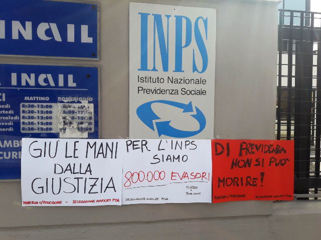 L'operazione "Minerva" nasce per contrastare l'operazione "Poseidone 2", intrapresa dall'Inps nei confronti di 800.000 giovani professionisti, che si sono così visti illegittimamente iscrivere d'ufficio alla Gestione Separata. Questa mattina si è tenuto un flash mob in tutta Italia, al quale ha partecipato anche una delegazione di avvocati della provincia pisana.