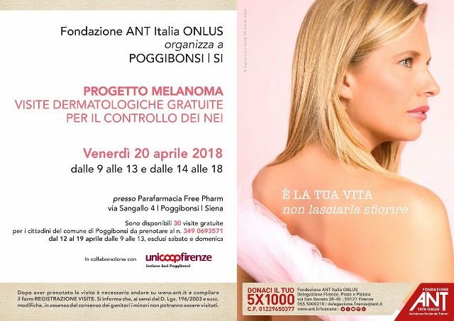 Dopo l’impegno di gennaio, febbraio e marzo nella città di Siena, Fondazione ANT Italia ONLUS porterà per la prima volta il Progetto melanoma anche nel Comune di Poggibonsi.