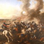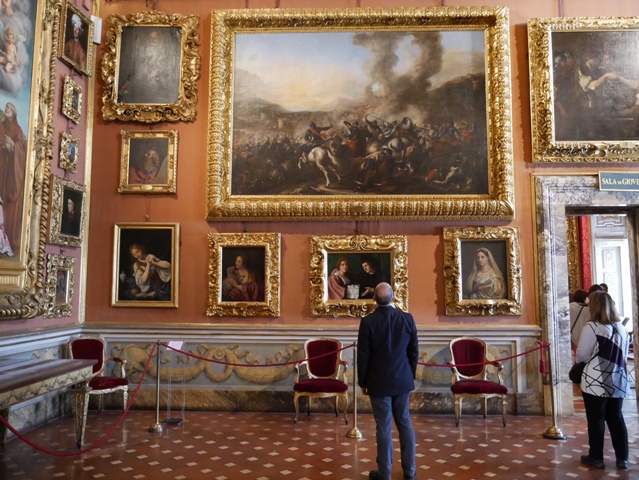 Nella sala di Giove della Galleria Palatina, durante i lavori era rimasta la monumentale cornice intagliata e dorata, che inquadrava l’enorme spazio (2 metri e mezzo per tre e mezzo) lasciato vuoto dal dipinto: essa ora è tornata ad inquadrare la presumibile veduta di una delle molte battaglie svoltesi durante la sfibrante guerra dei 30 anni che, a partire dal 1618, sconvolse buona parte dell’Europa.