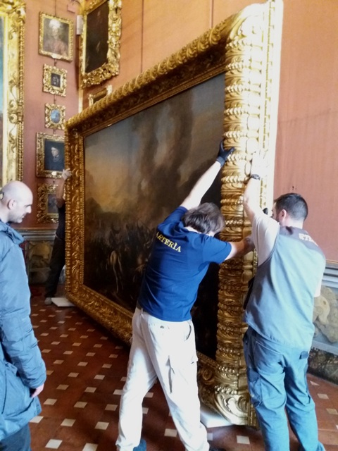 Nella sala di Giove della Galleria Palatina, durante i lavori era rimasta la monumentale cornice intagliata e dorata, che inquadrava l’enorme spazio (2 metri e mezzo per tre e mezzo) lasciato vuoto dal dipinto: essa ora è tornata ad inquadrare la presumibile veduta di una delle molte battaglie svoltesi durante la sfibrante guerra dei 30 anni che, a partire dal 1618, sconvolse buona parte dell’Europa.
