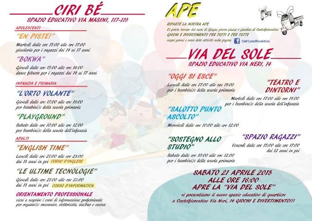 Il nome riprende l’antica intitolazione della strada: la “Via del Sole”, oggi Via Pompeo Neri, che si trova nel cuore del centro storico alto. E’ il nuovo spazio educativo di quartiere che sabato 21 aprile, alle ore 16.00, sarà inaugurato insieme a tutti i bambini e ai loro genitori nel paese alto, nell’ambito del progetto “Astra” e grazie a un finanziamento ottenuto attraverso il Bando periferie.
