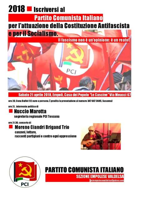 Sabato 21 aprile 2018, presso la Casa del Popolo “Le Cascine” di Empoli, in Via Meucci 67, si terrà una serata antifascista e di tesseramento al Partito Comunista Italiano.
