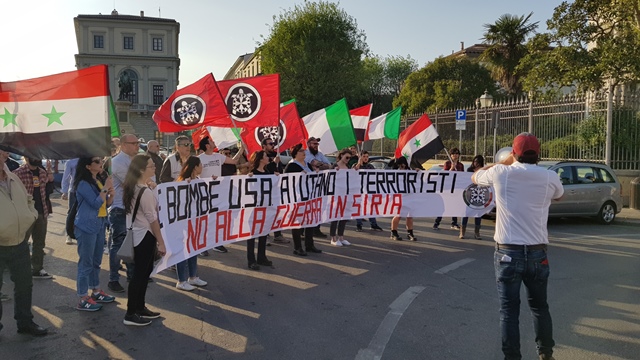 “Sono sette anni che USA, GB, e Francia ne stanno provando di tutte per di distruggere la Siria e mettere le mani sulle sue ricchezze”, proseguono i manifestanti, “sostenendo, armando e finanziando in medio oriente non dei ribelli democratici come spesso è stato detto da alcuni mass media compiacenti, ma dei veri e propri terroristi che hanno provocato centinaia di migliaia di morti e devastato un enorme patrimonio storico. L'attacco chimico russo-siriano è una clamorosa ‘bufala’ di cui non solo non sono state fornite prove concrete, ma che non avrebbe alcuna motivazione strategica visto che la guerra contro l’ISIS e contro gli altri gruppi di tagliagole islamisti è praticamente già stata vinta dal popolo siriano."