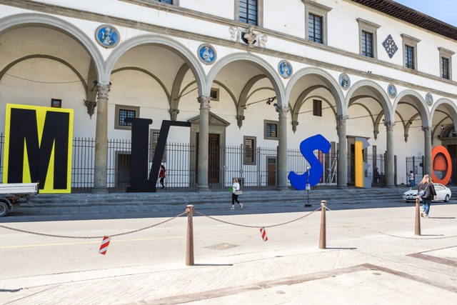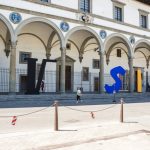 Al centro del chiostro, a catalizzare le linee e l'energia sviluppata dal colonnato rinascimentale, si fa spazio Araba Fenice, lavoro di Marco Bagnoli. Una sorta di ‘mongolfiera’ formata da raggi metallici che si originano da un piedistallo su cui è ritagliato il profilo dell’uccello mitologico che dà il titolo all’opera. La stessa forma della scultura, con il suo alternarsi di vuoti e fragili pieni, genera un contrappunto plastico e un richiamo al colonnato del chiostro. La mongolfiera, figura ricorrente e cara a Bagnoli, costituisce una sorta di “autoritratto spirituale”, un simbolo del viaggio di elevazione dell’artista che abbandona la materia muovendosi verso l’alto, al fine di compiere un’esperienza di purificazione interiore. Paolo Masi invece porta Invaders (2018) al Museo Novecento, uno specifico riadattamento dell’omonima serie, pensato per gli spazi del chiostro. I tondi in plexiglas, frutto della sovrapposizione di più strati di pellicola pittorica, inglobano segni differenziati, volti a creare un’esperienza percettiva singolare, capace di colpire l’immaginario del visitatore. La specifica collocazione sulle vetrate fa sì che gli elementi circolari reagiscano al variare della luce nelle diverse fasi del giorno, proiettando sulle pareti del loggiato un caleidoscopico insieme di forme e segni.