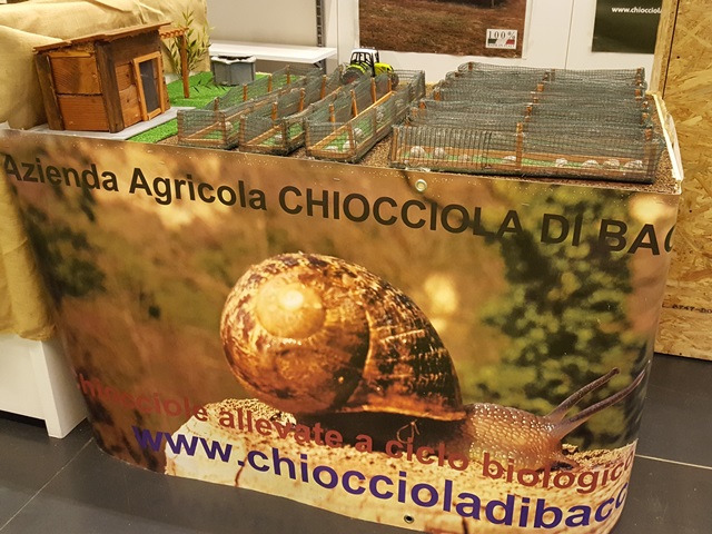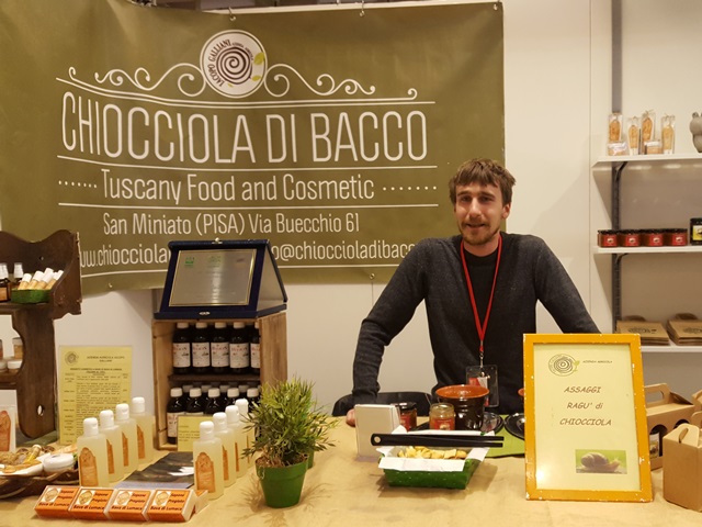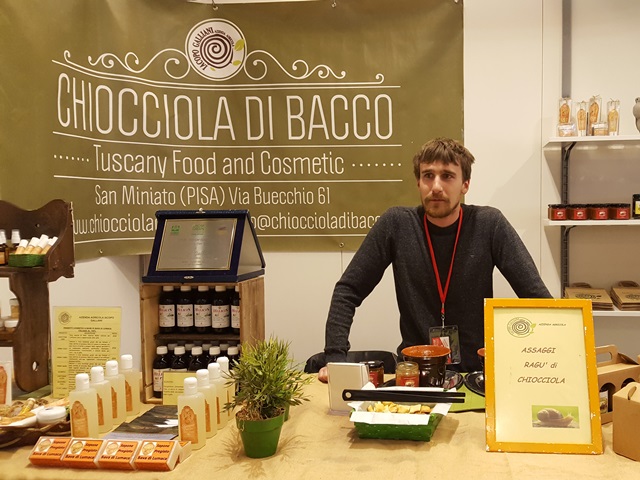Al primo piano del Padiglione Spadolini, dedicato alla gastronomia italiana e internazionale, Iacopo offre degustazioni di ragù di chiocciola e non solo. Le sue creme ed estratti a base di bava pura di chiocciola possiedono proprietà rigenerative e antiossidanti. Nel suo spazio espositivo ha creato una piccola farm in cui le protagoniste assolute sono le chiocciole vive, una piccola attrazione dello stand.