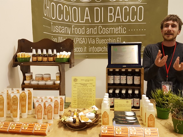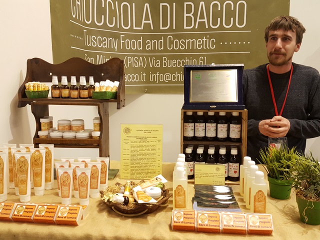 Iacopo Galliani è alla Mostra Internazionale dell'Artigianato di Firenze per la prima volta con le sue chiocciole. Direttamente da San Miniato il 28enne ha scelto di portare in Fortezza Da Basso i suoi prodotti di agricosmesi a base di bava di lumaca e la sua produzione gastronomica. Il motto di Iacopo è “La maestra di tutte le arti è la natura. L’agricoltura è l’arte di saper aspettare”.