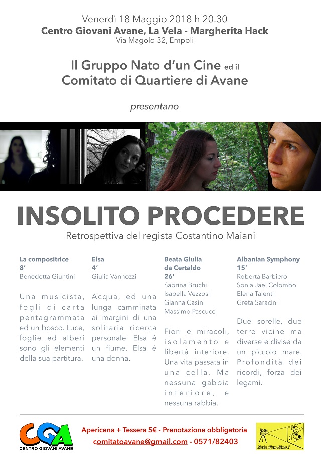 Venerdì 18 Maggio si terrà l'evento "Insolito Procedere", una retrospettiva di cortometraggi dedicata al regista fiorentino Costantino Maiani, che si terrà presso il Centro Giovani di Avane (via Magolo 32, Empoli).