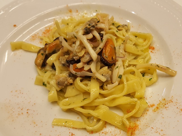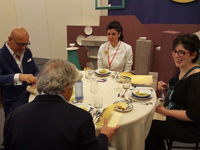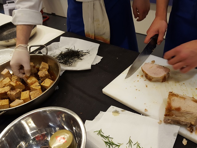 Il menu dei ragazzi del Vasari è composito e ricco. Per iniziare hanno servito agli 8 commensali della giuria, 'Uova pochè con crema di patate e chips'; 'Tagliolini con marinata di frutti di mare al profumo di agrumi e sabbia di pomodoro'; seguiti da 'Cubo di arista con maionese di spinaci , cipolle in agrodolce e aghi di melanzane' e per chiudere 'Millefoglie di biscotto bicolore con crema alla ricotta, cioccolato e peperoncino'.