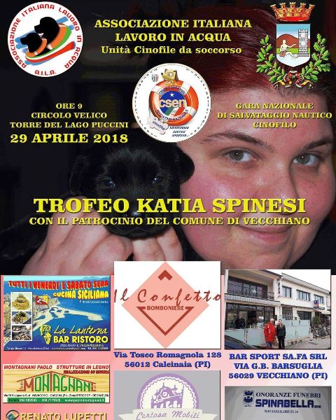 L’Associazione Italiana Lavoro in Acqua (Unità cinofile da soccorso) con il patrocinio del Comune di Vecchiano. Organizza il primo trofeo “Katia Spinesi”, che consiste in una gara di salvataggio nautico cinofilo di livello nazionale. Ci sarà anche una raccolta fondi a scopo benefico per i donatori di organi. Al circolo Velico di Torre del Lago Puccini, nel territorio comunale di Viareggio. Domenica 29 aprile alle 9.