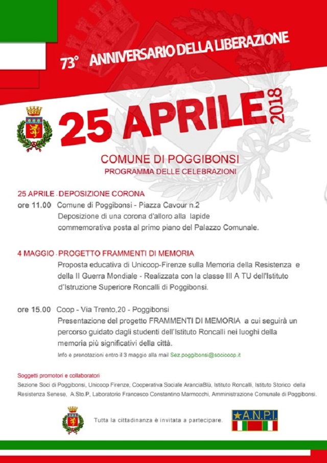 Le iniziative poggibonsesi proseguiranno il 4 maggio con il progetto “Frammenti di memoria”, una proposta educativa di Unicoop Firenze realizzata con la classe III A TU dell’Istituto di Istruzione Superiore Roncalli di Poggibonsi (soggetti promotori e collaboratori: sezione soci di Poggibonsi, Unicoop Firenze, cooperativa sociale AranciaBlu, Istituto Roncalli, Istituto Storico della Resistenza Senese, Astop, Laboratorio Francesco Costantino Marmocchi, Amministrazione Comunale). Alle 15 presso la Coop di via Trento il progetto sarà presentato e seguirà il percorso guidato dagli studenti nei luoghi della memoria più significativi della città. Prenotazioni entro il 3 maggio a Sez.poggibonsi@socicoop.it