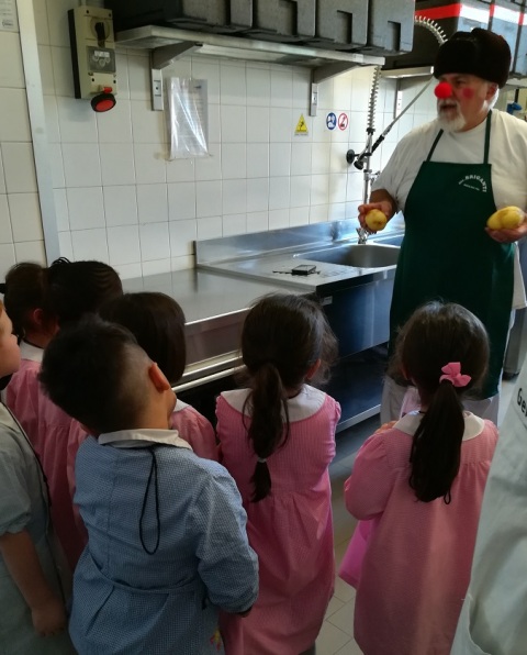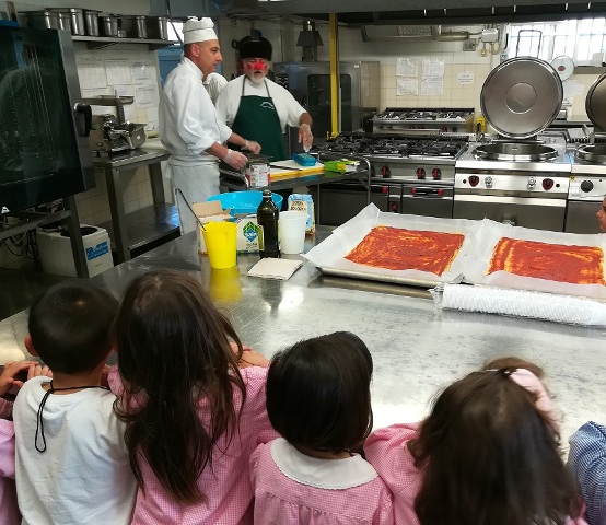In ogni appuntamento i bambini sono stati accolti e accompagnati da un cuoco-clown di varie nazionalità (tedesco, francese e russo) che con musica, balli e indovinelli ha fatto scoprire ai bambini le magiche attrezzature della cucina centralizzata; gli alunni hanno anche potuto assistere alla “magia” di farina + acqua + pomodoro + mozzarella trasformarsi in una gustosissima pizza, che hanno poi degustato.