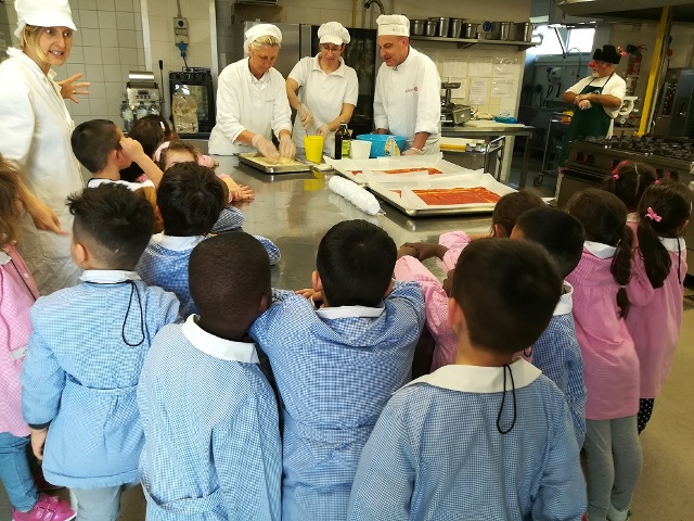Per l’occasione, anche il capo della brigata si è presentato ai più piccoli: lo chef comunale Michelangelo Vitale insieme allo chef Elior Fabrizio Rossi, aiutati dal Sous-Chef Veronica Botrini e dai collaboratori Antonia Fastella e Sara D’Agostino, hanno raccontato aneddoti e curiosità del loro lavoro, permettendo agli alunni di cimentarsi in un divertentissimo laboratorio didattico.