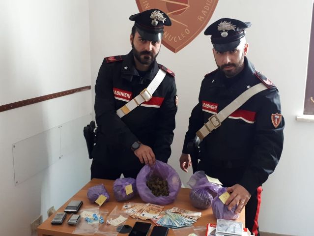 Ulteriori accertamenti e la perquisizione dell’abitazione dell’uomo e delle sue pertinenze, permetteva ai Carabinieri di rinvenire, debitamente occultale, altre somme di danaro per un totale di alcune migliaia di euro nonché 600 gr di marijuana, 20 di cocaina e 50 di hashish, nonché tutto il necessario per il confezionamento dello stupefacente al fine dello spaccio.
