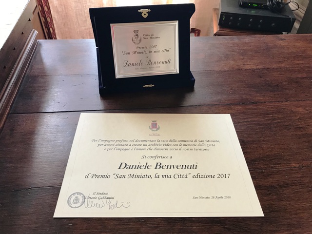 “Daniele prima di essere un cittadino di San Miniato è un amante della nostra Città – spiega il sindaco Vittorio Gabbanini -. L'impegno che mette nel documentare la vista cittadina con filmati che sono per tutti e di tutti è davvero straordinario. Con grande umiltà, senza mai risparmiarsi, è riuscito a documentare momenti molto importanti della vista comunitaria, penso all'inaugurazione della Biblioteca di San Miniato, tra le ultime sue realizzazioni. Ma Daniele ha fatto ancora di più: insieme ad altri cittadini, sta ricostruendo video-interviste che andranno a corredare i materiali del Museo della Memoria. Un lavoro certosino, che sta compiendo con grande passione e dedizione. Grazie a lui San Miniato avrà un archivio video con le testimonianze degli ultimi sopravvissuti, patrimonio che va ad arricchire tutti noi – e conclude -. Per questo l'amministrazione comunale ha ritenuto giusto premiare la sua passione e il suo amore per questa Città”.