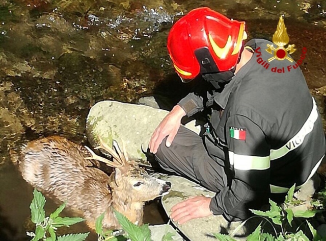 Un capriolo rimasto ferito è stato recuperato dai vigili del fuoco del distaccamento di Montecatini Terme nella mattina di oggi, lunedì 30 aprile. L'ungulato è finito nel torrente Nievole, all'altezza dell'omonima località. I pompieri hanno agilmente raggiunto la bestiola, riportandola a riva e affidandola al medico veterinario della Asl Toscana Centro venuto da Pistoia.