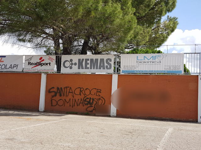 La Santa Croce sull'Arno calcistica si è svegliata con l'amaro in bocca per la sconfitta della Cuoiopelli in finale allo spareggio per la Serie D con il San Gimignano. L'amaro è aumentato quando i santacrocesi hanno scoperto una scritta offensiva sul muro esterno allo Stadio Libero Masini. "Santa Croce domina su sto c***" è lo slogan inciso con lo spray all'esterno dello stadio. ù