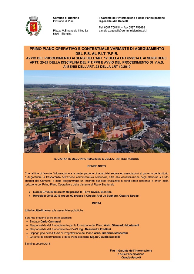 Il Comune di Bientina informa che sono in programma due incontri per la condivisione di contenuti e criteri di redazione del Primo piano operativo e della Variante al Piano strutturale del comune di Bientina.