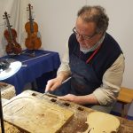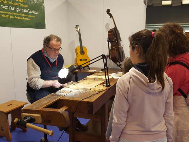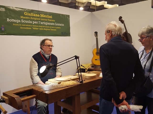 Giuliano Merlini Maestro Artigiano Liutaio arriva da Bagno a Ripoli, dove tiene la sua bottega scuola, la prima accreditata presso la Regione Toscana. Liutaio da 30 anni, dopo la scuola a Parma, il maestro Merlini apre la sua attività nel 1996. Da tre anni ha deciso di tramandare il suo sapere ai giovani e ha aperto la bottega scuola. Un percorso di 5 anni per i ragazzi che vogliono diventare liutai. È il secondo anno che sceglie la Mostra dell'Artigianato per esporre i suoi prodotti e far conoscere la sua scuola ed è uno degli artigiani che espone nell'ambito di Cna Toscana.