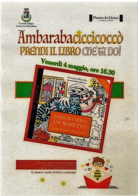 Venerdì 4 maggio alle ore 16.30, presso la biblioteca comunale, si terrà l'ultimo dei laboratori della serie “Ambarabaciccicoccò prendi il libro che ti do!” dal titolo: “Come si cucina un sonetto” con merenda finale.