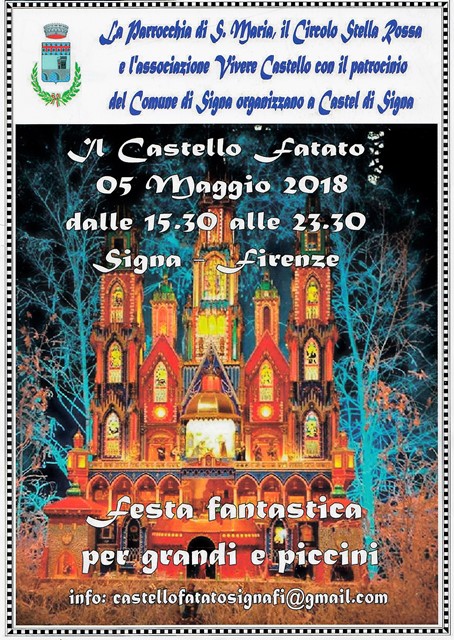 Sabato 5 maggio invece, dalle 15.30 alle 23.30, piazze e vicoli del Castello di Signa verranno invasi dai banchi e dalle animazioni de “Il Castello Fatato” una festa fantastica dedicata a grandi e piccini con l'organizzazione della parrocchia di Santa Maria in Castello, del Circolo Stella Rossa e dell'associazione Vivere Castello.