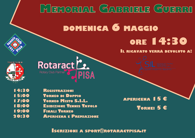 Il Rotaract Club Pisa, in collaborazione con il Tennis Club Pisa, l’Associazione Sport Insieme Livorno (S.I.L.) e ASD Tennis Tavolo ACSI Pisa, organizzano domenica 6 maggio 2018 il Memorial Gabriele Guerri (socio Rotaract prematuramente scomparso)presso il Tennis Club Pisa in Piazzale dello Sport, 7.