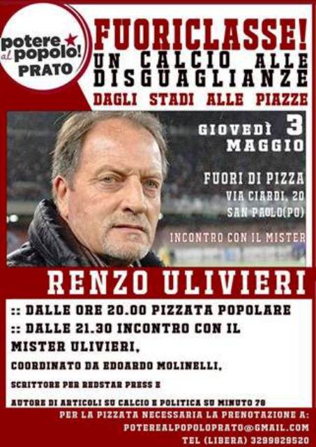 Giovedì 3 maggio l'assemblea territoriale di Potere al Popolo di Prato organizza un incontro aperto con Renzo Ulivieri, presidente della federazione degli allenatori italiani e attivo sostenitore del percorso di alternativa a sinistra.