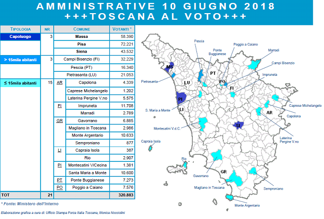 Così come dal 2015 in qua, anche quest’anno in vista delle elezioni amministrative del 10 giugno 2018 il centrodestra toscano si presenta unito in tutti i 21 Comuni chiamati alle consultazioni elettorali.