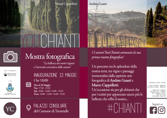 La prima mostra di YouChianti si terrà dal 13 al 26 Maggio 2018 e avrà luogo nella sala consiliare del Comune di Tavarnelle Val di Pesa. Il tema dominante sarà incentrato sulla bellezza dei vigneti e sull'armonia cromatica della natura. Saranno esposte circa 70 foto e proiettato un video realizzato con drone professionale.