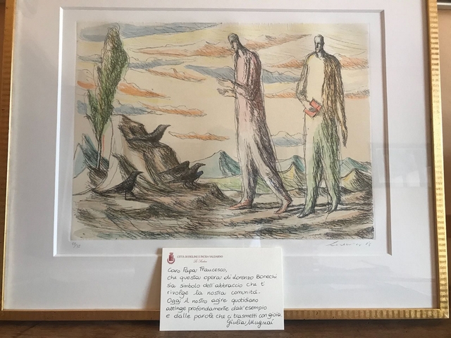 “Ringrazio la famiglia Bonechi per il prezioso dono – spiega la sindaca di Figline e Incisa Valdarno, Giulia Mugnai -, il dono di un artista che ha lasciato un profondo segno nella nostra comunità sia a livello pittorico che umano. Per la sua intensità, i colori e il suo stile nell’affrontare il tema religioso, ci è sembrato il modo migliore per accogliere il Santo Padre in questa sua visita”.