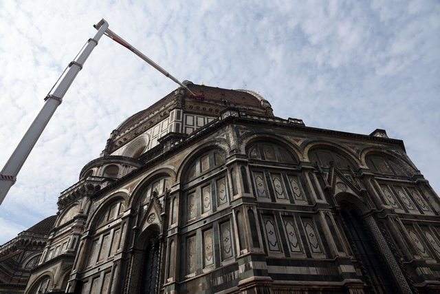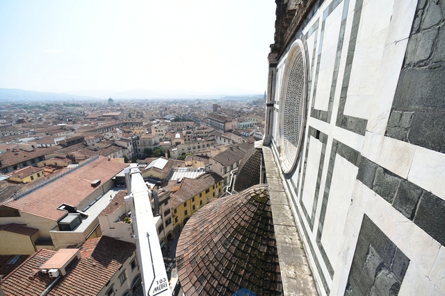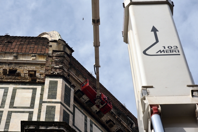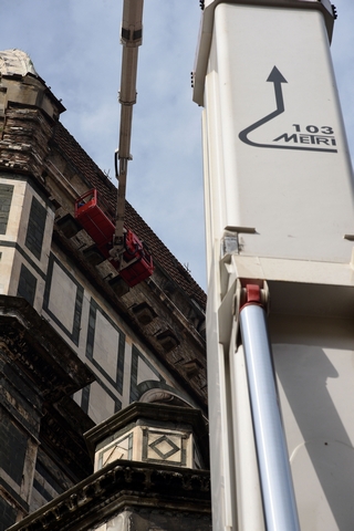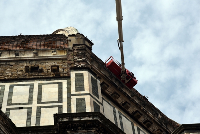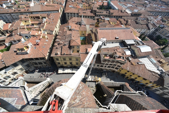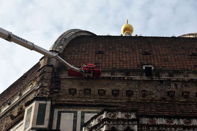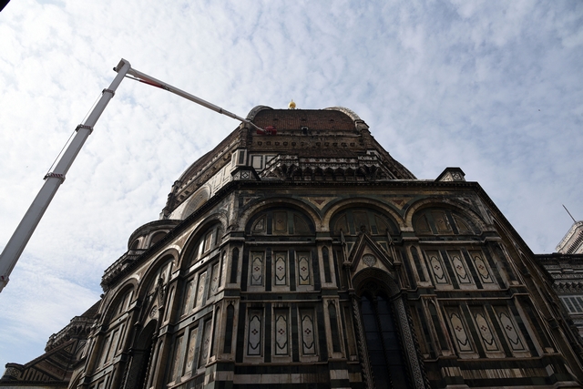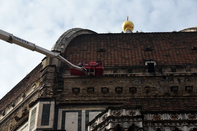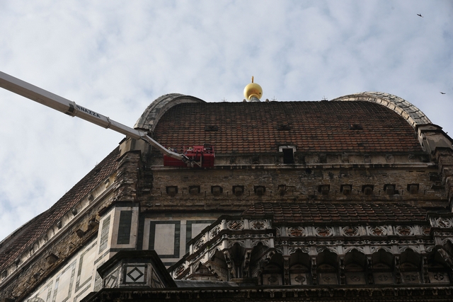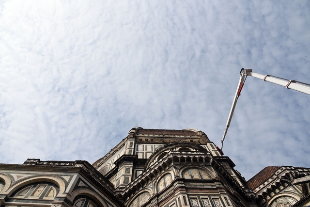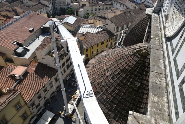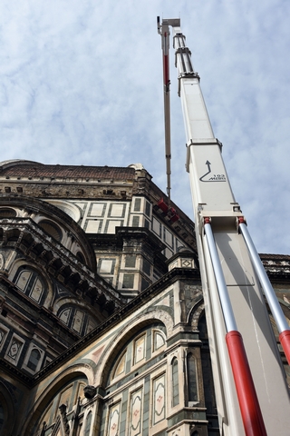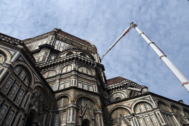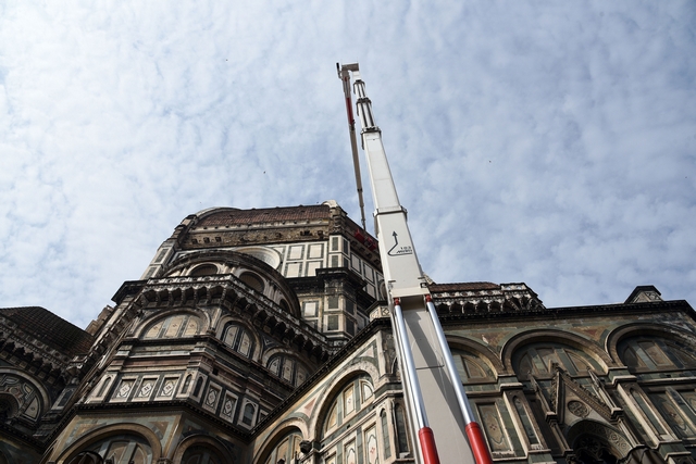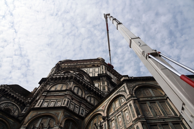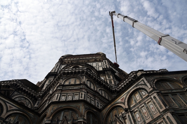 Sono iniziati i lavori di monitoraggio delle superfici marmoree esterne del Duomo di Firenze, del Campanile di Giotto, della Cupola del Brunelleschi e del Battistero che andranno avanti tre settimane. I lavori sono eseguiti dal personale dell’Opera di Santa Maria del Fiore con l’ausilio di un’autogru con un braccio di 103 metri che permette di raggiungere anche le zone più alte del Campanile di Giotto e della Cupola del Brunelleschi.
