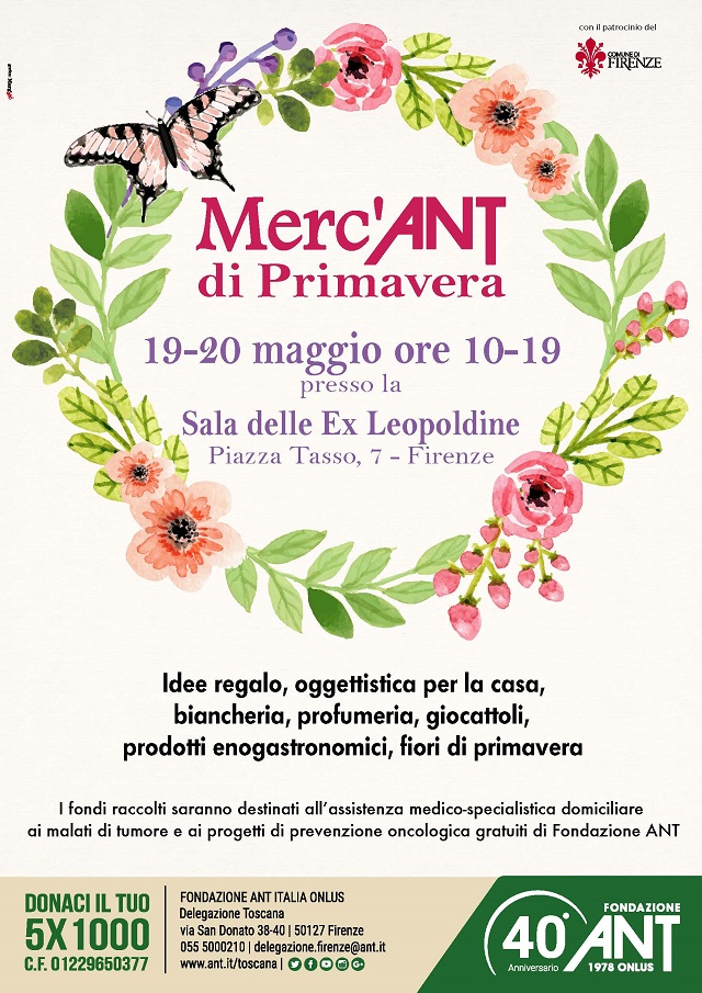 Sabato 19 e domenica 20 maggio ANT trasformerà la Sala delle Ex Leopoldine in Piazza Torquato Tasso n.7 a Firenze, gentilmente concessa in uso gratuito da Quartiere 1 del Comune di Firenze, in una bottega di prodotti tipici del territorio donati da aziende locali. Tra i prodotti eno-gastronomici che si potranno trovare figurano: vini bianchi e rossi di importanti tenute toscane, pasta artigianale, riso, biscotti secchi e dolci, sughi pronti, conserve, miele, sale speziato e molto altro. Inoltre non mancheranno i fiori di primavera e articoli di profumeria, biancheria per la casa, oggettistica, abbigliamento e giocattoli frutto della solidarietà di aziende e privati e confezionati dai volontari ANT senza i quali non sarebbero possibili queste iniziative. La Fondazione ANT infatti è sempre alla ricerca di volontari per sostenere le proprie iniziative di raccolta fondi. La manifestazione gode del patrocinio del Comune di Firenze e la collaborazione del Quartiere 1. Tutti i fondi raccolti saranno devoluti a sostegno delle attività che ANT svolge a Firenze, Prato e Pistoia.